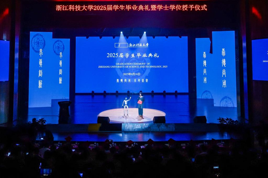 “大家好,我是小科。非常荣幸能在这个意义非凡的日子里,与大家共同见证属于2025届毕业生的荣耀时刻!”6月16日,2025届浙江科技大学学生毕业典礼暨学士学位授予仪式在小和山校区举行,由我校机器人产业学院调试的人形机器人“小科”稳健地“走”上舞台,用科技感开启这场盛典。校党政领导班子成员出席。典礼由校党委副书记张日向和本科毕业生王雨诺一同主持。校党委书记赵东福、校长陈建孟共同为省级、校级优秀毕业生代表颁发...