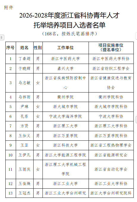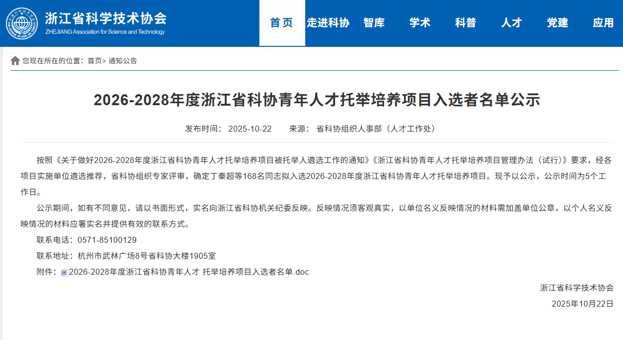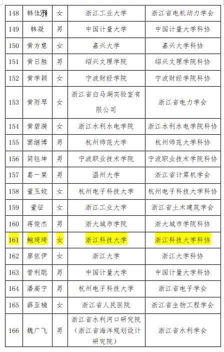 经学校遴选推荐和浙江省科学技术协会组织专家评审,我院鲍琦琦老师入选2026-2028年度浙江省科协青年人才托举培养项目。本次项目评选,共有168名来自全省高校、科研院所和医院等单位和行业协会的青年人才入选,我校占据其中2席。