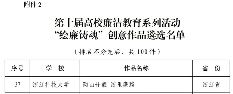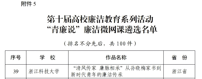 近日,教育部思想政治工作司公布了第十届高校廉洁教育优秀作品、课程名单,我院两件作品在全国评选中脱颖而出,其中《两山廿载 浙里廉路》入选“绘廉铸魂”创意优秀作品,《“清风传家 廉脉相承”从孙晓梅家书到新时代青年的廉洁传承》入选“青廉说”廉洁优秀微网课。